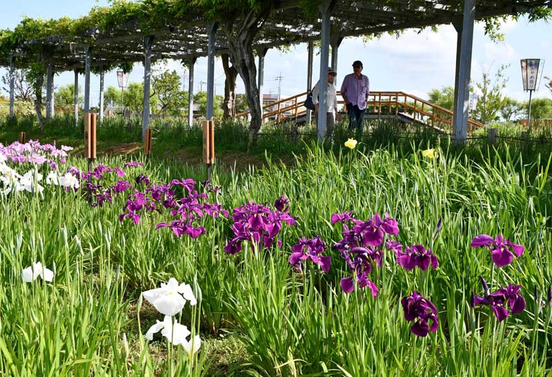 同パークによると、8ヘクタールの園内には江戸、肥後、伊勢系など約400種150万本のハナショウブが品種ごとに植えられている。現在は二分咲きで、6月上旬に見頃を迎える。茨城県潮来市のあやめ園と連携し、両園を結ぶ無料のシャトルバスを運行するなど水郷地域の観光を盛り上げる。