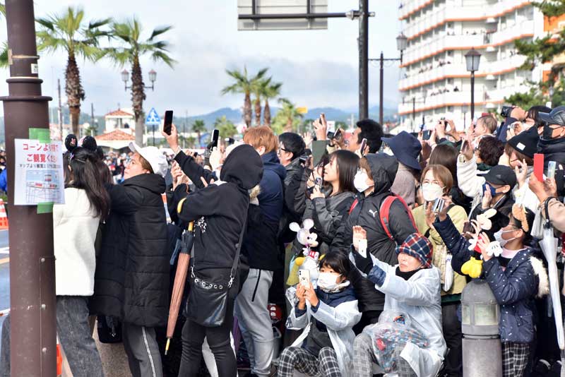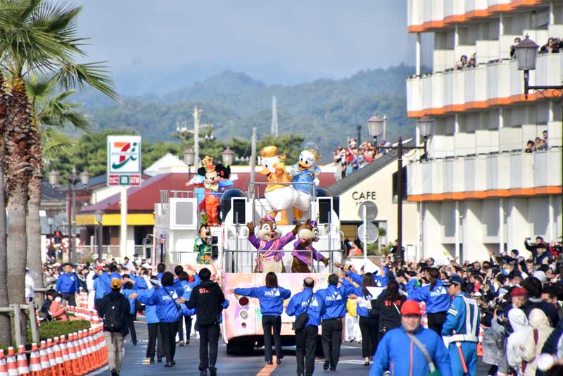 館山市の鏡ケ浦通りで12日、「館山チアアップ・千葉県誕生150周年記念パレード」が行われた。パレードには、ミッキーマウスら東京ディズニーランド(TDL)の人気キャラクターも登場。沿道には同市の人口を超える約5万7千人が詰めかけ、同市誕生以降かつてないほどのにぎわいを見せた。