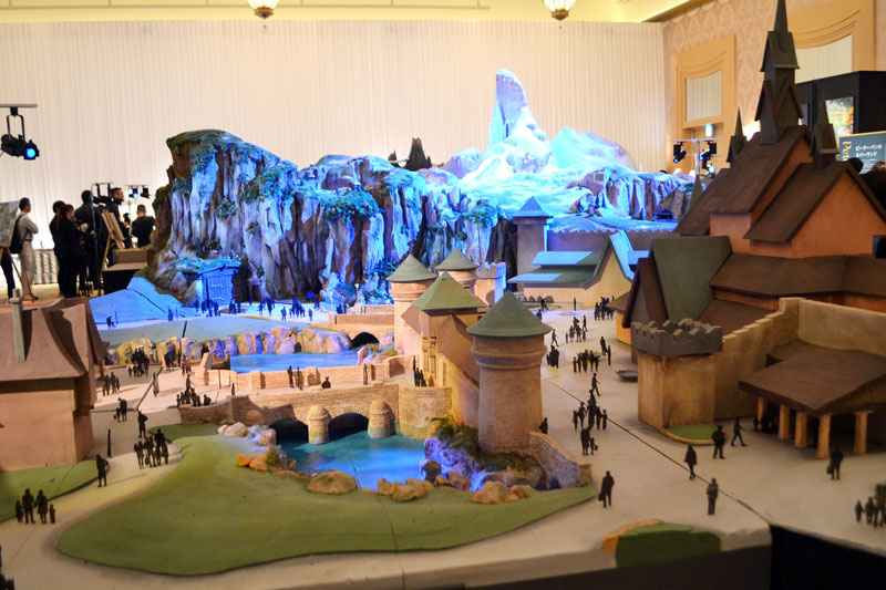 東京ディズニーシー(TDS、浦安市)の新エリア「ファンタジースプリングス」のオープンまで100日になった27日、運営するオリエンタルランドは大ヒットアニメ映画「アナと雪の女王」などの映画の世界を再現した新エリアの模型を初披露。従業員のコスチュームや新グッズもお披露目した。新エリアのオープンは6月6日。