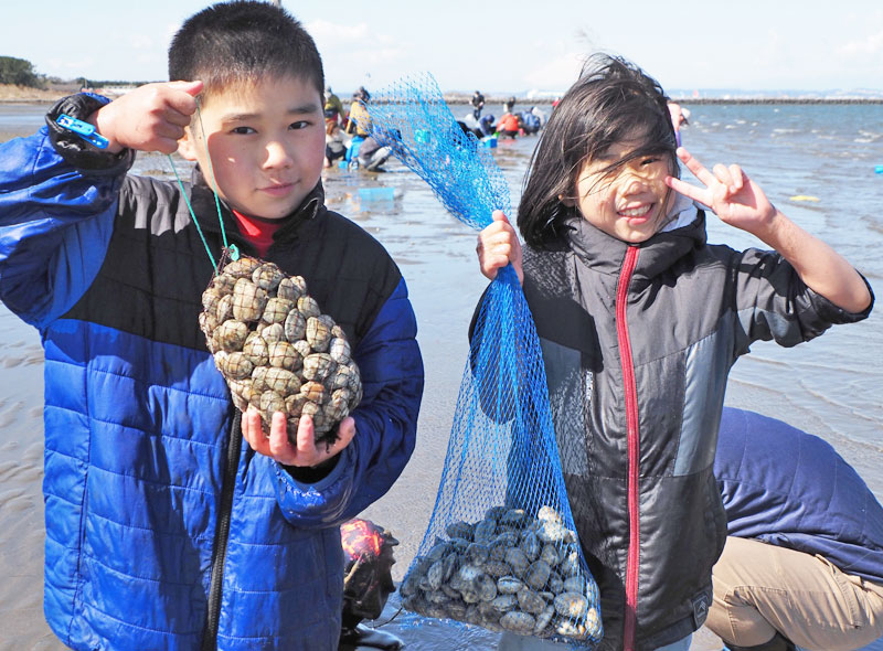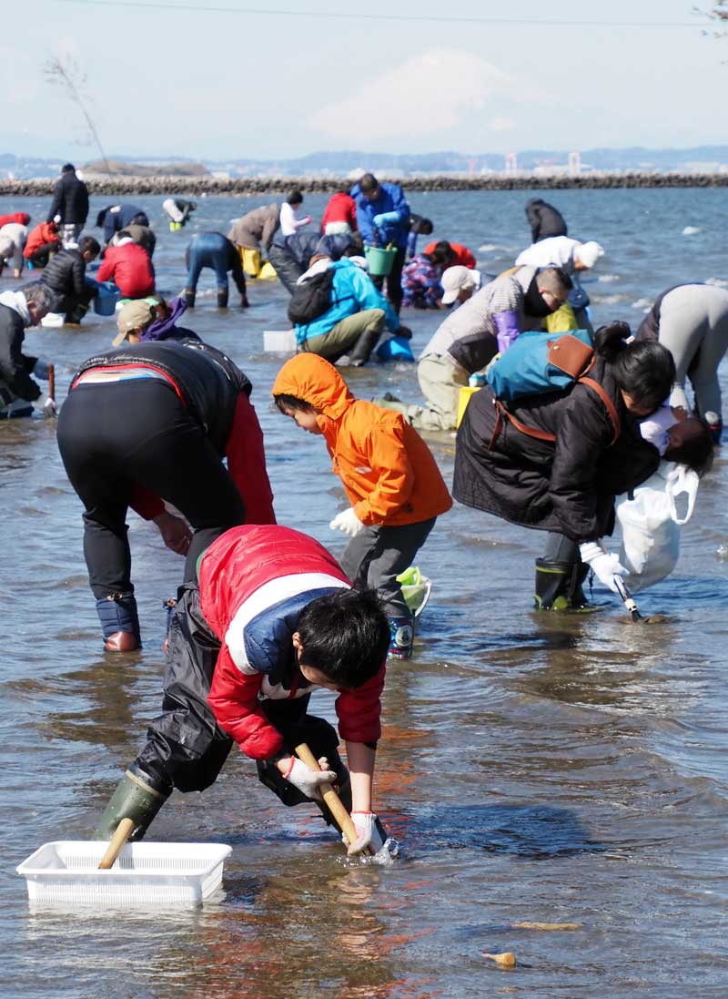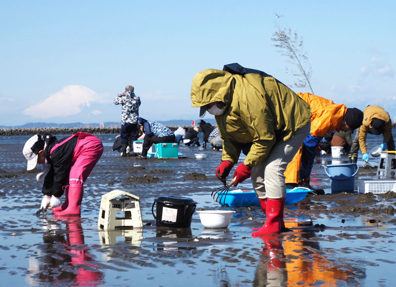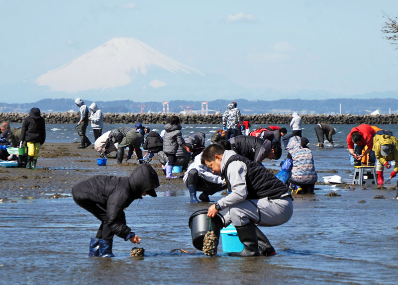 東京湾に春の訪れを告げる潮干狩りが9日、富津市富津の富津海岸で始まった。冷たい北風が吹きつけたものの富士山を望める青空の下、首都圏から訪れた大勢の家族連れらが砂浜を掘り返しながら歓声を上げた。