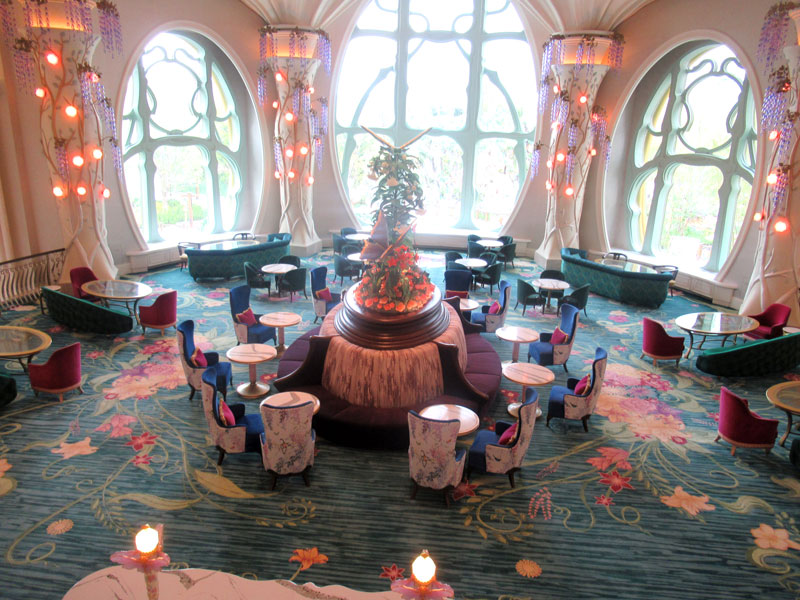 ただ、その最大の魅力は館内外にちりばめられたディズニー映画の面々ではない。キャストのコスチュームを含め至る所に装飾が施された花や草木のイメージであり、客室のテラスやロビーから見える岩や水の流れだ。メインエントランスから入って正面の大きな窓から降り注ぐ自然光で館内はキラキラ輝き、天候により表情を変える。この全体が「魔法の泉」(ファンタジースプリ...