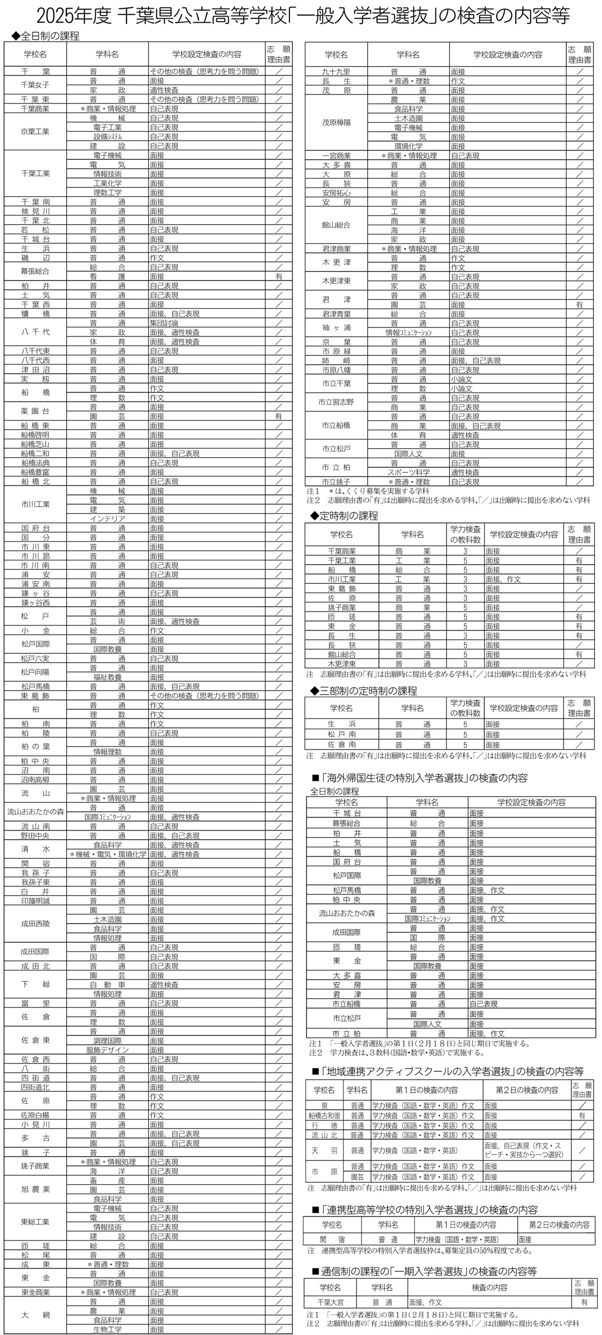#速報#千葉の入試情報#高校入試 #千葉県 2024/7/10 5:39 (4/15 14:09更新) 有料記事 保存 拡大する ※写真はイメージ 来春の千葉県内公立高校入試(2025年度入学)について、県教委は10日、共通の学力検査に加えて行う各校の独自検査内容を発表した。例年通り「面接」の採用校が最多で、県立・市立高の全日制118校192学科のうち72校114学科で実施する。 県教委学習指導課によると、独自検査は面接... この記事は 有料記事です 残り284文字(全文423文字) 関連記事/あわせて読みたい 千葉県立高入試2月18、19日 全校にネット出願導入 最新!大きく変わっている大学入試 【合格への助走 市進受験ナビ】 #速報#千葉の入試情報#高校入試 #千葉県 前の記事【新型コロナ速報】千葉県内、感染者1・18倍に 7月1~7日 2203人感染報告 1医療機関当たり10・91人次の記事【速報】幼い息子に平手など暴行、死なせたか 傷害致死疑い、船橋の20代母親を逮捕 千葉県警