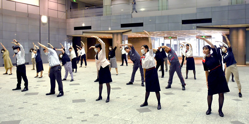 数十キロの重い荷物を運んだり、一日で1万~2万歩分の長距離を歩いたりと体を動かす仕事が多い空港。そんな職場で働くスタッフの身体的な健康を支えようと、JALグループは成田空港で社員に対し、けが予防の準備体操や仕事の合間のリラックスにつながるラジオ体操の浸透を図っている。