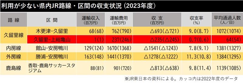 久留里線木更津―久留里間(同6億9300万円、2800万円減)、同線久留里―上総亀山間(2億3500万円、1千万円減)は若干改善した。