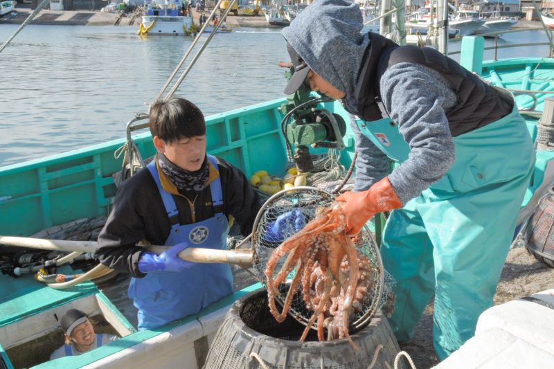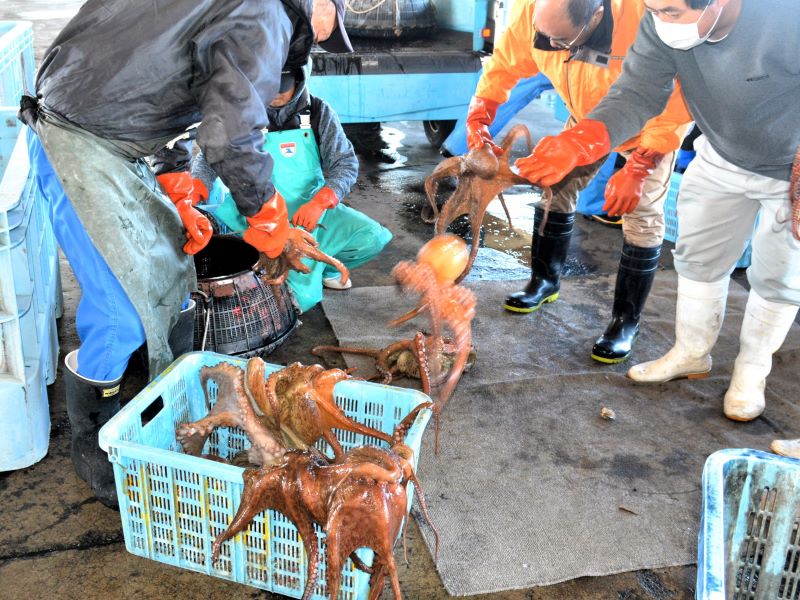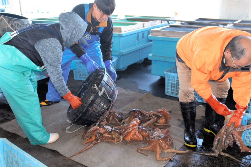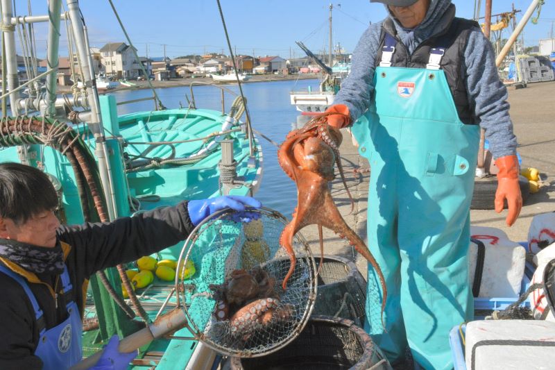 いすみ市の大原漁港で16日、冬の味覚として人気のマダコが今季初水揚げされた。大原産は「西の明石、東の大原」と称され、明石海峡(兵庫)などで捕れるマダコと並んで国内の二大蛸(たこ)といわれる。漁業関係者によると、水揚げされたマダコは柔らかく甘みがあるという。