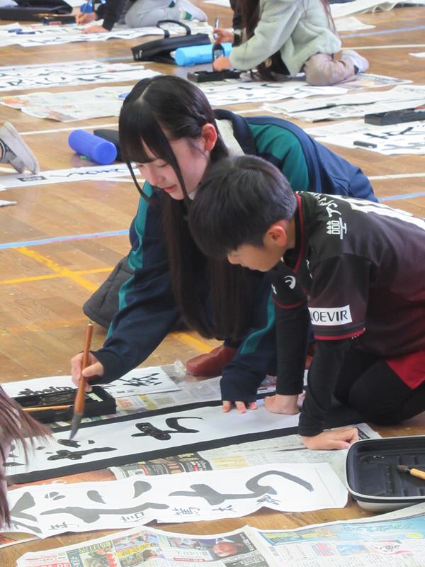 市川市立信篤小学校で、県立市川南高校の書道部員が3年生児童に「書き初め」を指導した。熱心に書道の魅力を教える部員に、大型の用紙に書くのが初めての児童らは元気よく筆を走らせて応えた。