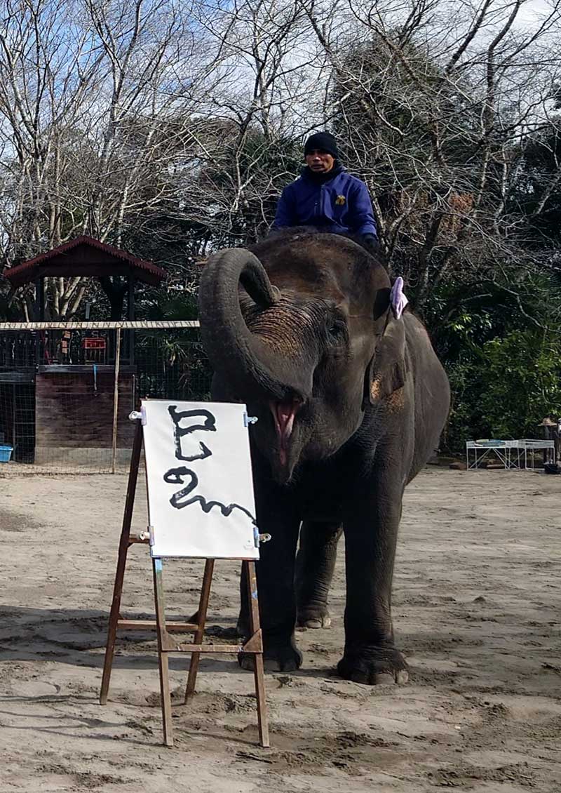 市原市の動物園「市原ぞうの国」で4日、正月にちなんだ特別パフォーマンスが披露され、日本生まれのアジアゾウの4姉妹が、干支(えと)の書き初めや絵描きに挑戦した。会場に集まった親子連れら400人は「すごい」などと歓声を上げ、新年を祝うパフォーマンスを楽しんだ。