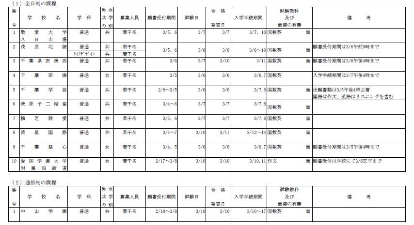#速報#千葉の入試情報#高校入試 #千葉県 2025/2/26 4:07 (4/15 14:09更新) 有料記事 保存 拡大する 写真はイメージ 千葉県は26日、県内私立高校入試(今春入学)の2次募集状況を発表した。25日正午現在で、全日制10... この記事は 有料記事です 残り143文字(全文193文字) 関連記事/あわせて読みたい ▶千葉の高校入試・中学入試情報 千葉県公立高校入試 問題・解答(国数英) 千葉県公立高校入試 問題・解答(理社、思考力を問う問題) 【一覧表】私立高志願倍率 千葉県内前期試験 昭和学院秀英(普通)14・48倍 小中学生の学びを応援!入試対策連載「合格への助走 市進受験ナビ」 #速報#千葉の入試情報#高校入試 #千葉県 前の記事伐採した木にぶつかり死亡… 労働安全衛生法違反の疑い、土木工事業者を書類送検 東金労働基準監督署次の記事【速報・追記あり】日鉄君津シアン流出問題 会社と担当者を書類送検、千葉海保 「過失」で法定基準満たさず排水口に 水質汚濁防止法違反容疑