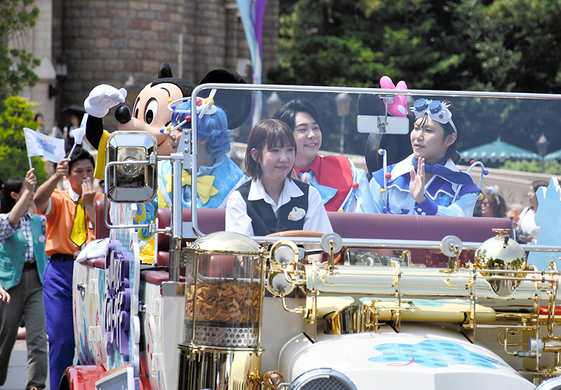 浦安市舞浜の東京ディズニーリゾート(TDR)であす2日、水をふんだんに使った夏の特別イベント「サマー・クールオフ」が始まる。今年は恒例の「びしょ濡れ」イベントに加え人気ロックバンド「Mrs. GREEN APPLE」(ミセス・グリーン・アップル)とのコラボが実現、テーマソングとして書き下ろした楽曲が流される。報道陣に事前公開された1日はメンバー3人がミッキーマウス、ミニーマウスと一緒にオープンカーでサプライズ登場。来園客から大きな歓声が上がった。