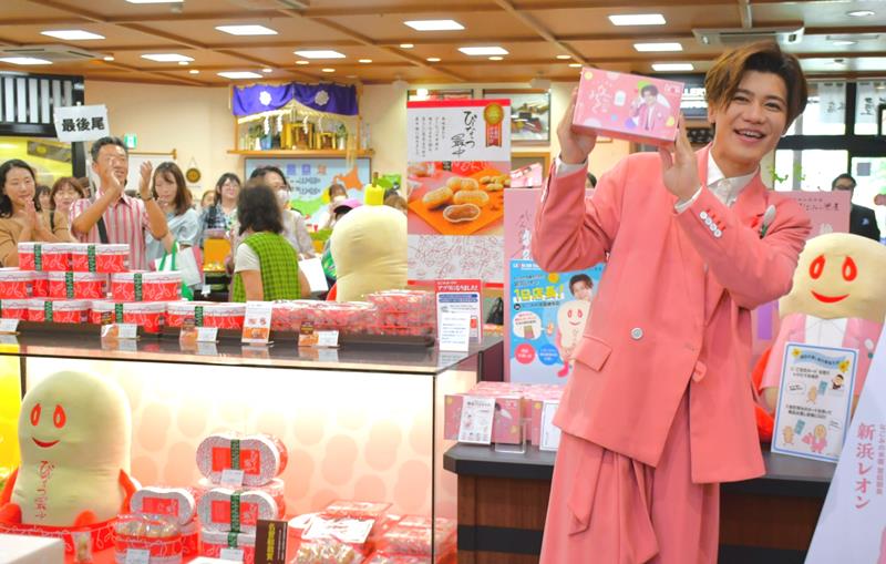 白井市出身の歌手、新浜レオンさん(29)が21日、成田市の成田山新勝寺参道で営業する和菓子店「なごみの米屋総本店」で一日店長を務めた。同店を運営する米屋(同市)の宣伝部長に6月に就任した一環で企画された。新浜さんは集まったファンを前に「千葉の魅力を伝えていきたい」と意気込んだ。