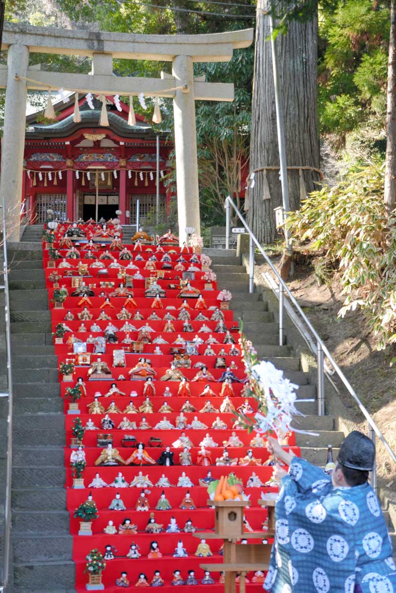 同日は住民35人が参加。52段の石段に緋毛氈(もうせん)を敷き、約1時間でひな人形450体を並べた。祈とうでは、同神社の平田長保禰宜(ねぎ)が祝詞を上げ、市議や小湊鉄道の...