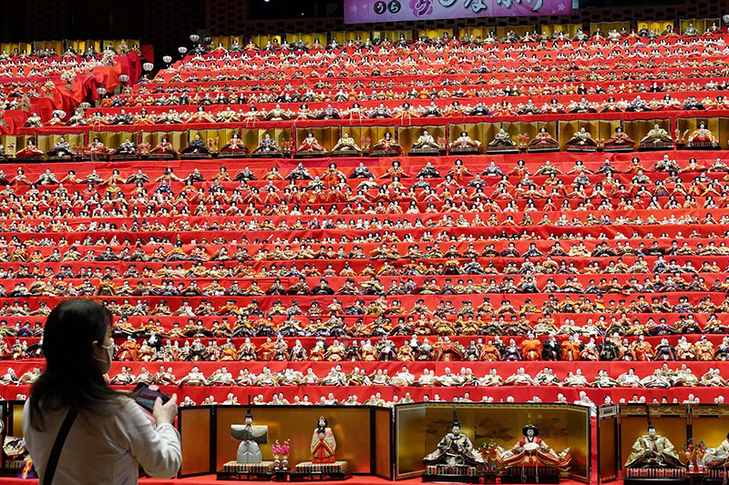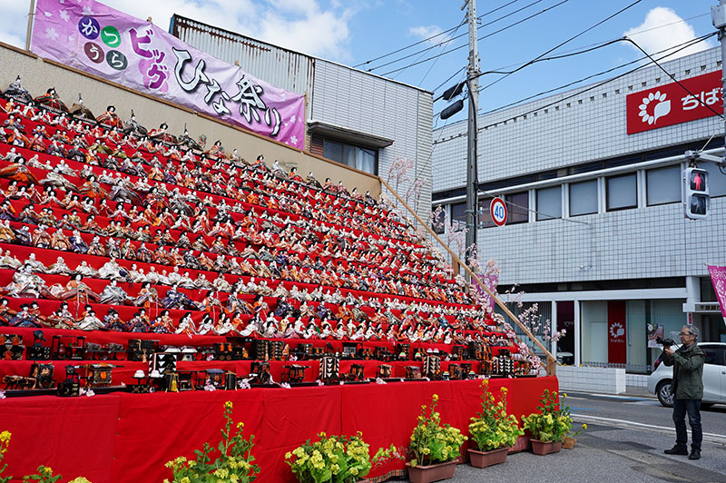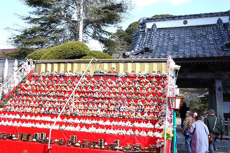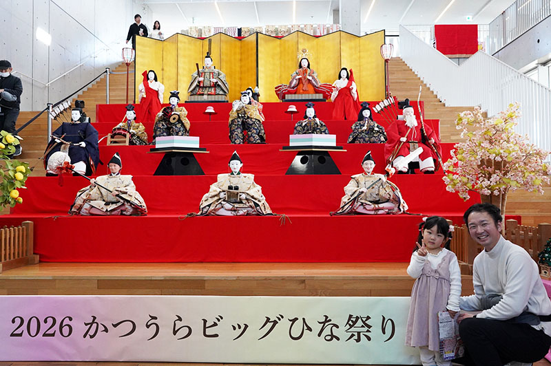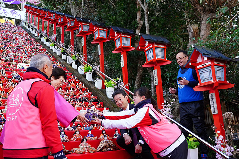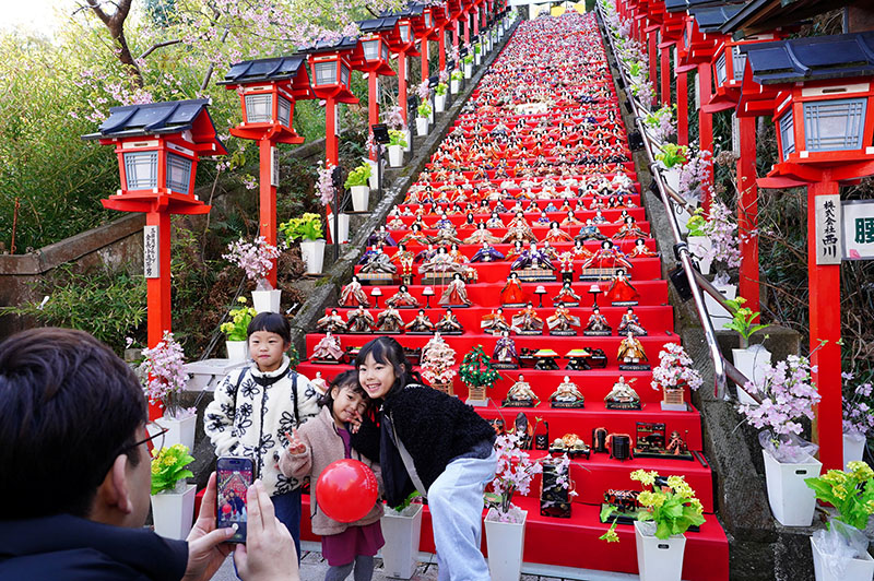 全国から寄贈された約2万5千体のひな人形を街中に展示する勝浦市の「かつうらビッグひな祭り」(実行委員会主催)が21日、開幕した。見どころの一つの遠見岬(とみさき)神社の石段60段に約1800体が飾られるなど華やかな光景が来場者を魅了している。