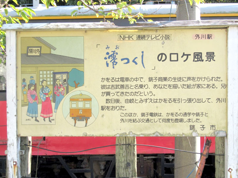現在の銚電は、明治時代に銚子まで開通した鉄道をさらに延伸することについて紆余(うよ)曲折を経た後、大正時代に地元有志が設立した会社によって外川まで敷設された鉄道です。外川駅舎は開通当時のまま使われています。駅舎脇には銚子が舞台のNHK朝ドラ「澪つくし」のロケ地を示す看板が設置されています。