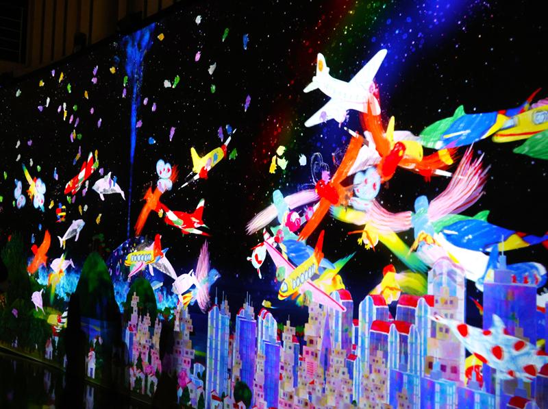 成田空港に近い芝山町の航空科学博物館で20日、最先端のデジタル技術を用いたアート集団「チームラボ」の体験型作品の期間限定展示が始まる。19日に開かれた関係者向け内覧会では、縦約4メートル、横約18メートルの巨大なモニターに多彩な絵が出現。絵は参加者の操作によって自由自在に動く仕組みになっており、世界の見え方についても考えさせるような展示空間となっている。