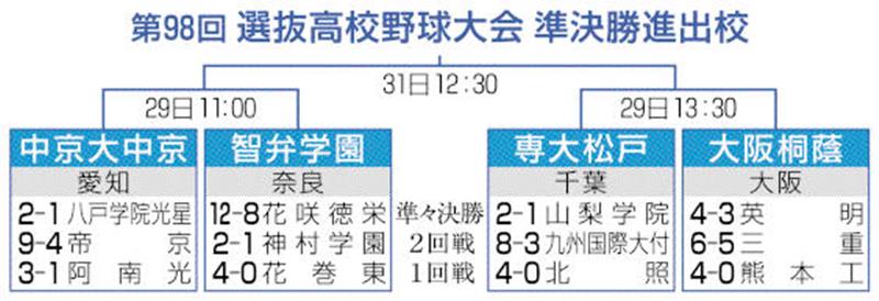 選抜高校野球大会は29日、甲子園球場で中京大中京(愛知)-智弁学園(奈良)、専大松戸-大阪桐蔭の準決勝が行われる。4校は28日、関西各地で最終調整し、初の準決勝に臨む専大松戸は、兵庫県西宮市の球場で速球派の相手投手を想定し、フリー打撃などに時間を割いた。