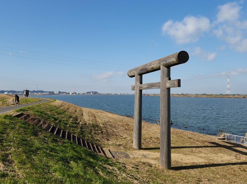 堤の内側には「津宮浜鳥居」という香取神宮一の鳥居が立っています。かつて利根川水運隆盛の頃の香取神宮表参道口がここです。石灯篭は燈台の役目...