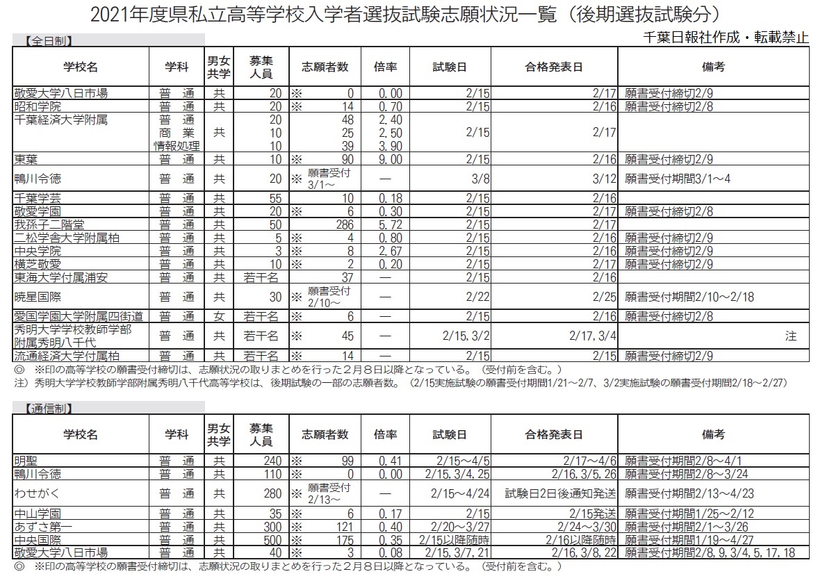 #速報#千葉の入試情報#志願倍率#高校入試 #千葉県 2021/2/9 9:19 (4/15 14:09更新) 有料記事 保存 千葉県は9日、今春の県内私立高入試(2021年度入学)の後期選抜試験分の志願状況(速報値)を発表した。全日制16校の募集人員283人(前年度確定値比232人減)に対し、志願者数は634人(同746人... この記事は 有料記事です 残り264文字(全文364文字) 関連記事/あわせて読みたい 千葉県内私立高 前期試験、志願倍率4・02倍 <募集要項一覧>私立高1万2920人募集 千葉県内 千葉県内公立高志望調査 全日制1・10倍 最高は県船2・31倍 コロナ感染に特例追試 来春の県内公立高校入試 千葉県教委 受験生にもPCR検査補助 千葉・松戸市 #速報#千葉の入試情報#志願倍率#高校入試 #千葉県 前の記事【オンライン先行公開】2021年高校入試情報まとめ【掲載予定もこちら】次の記事ひょっこり男追送検 流山であおり疑い