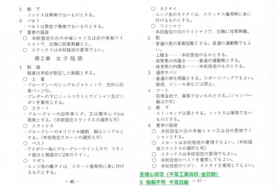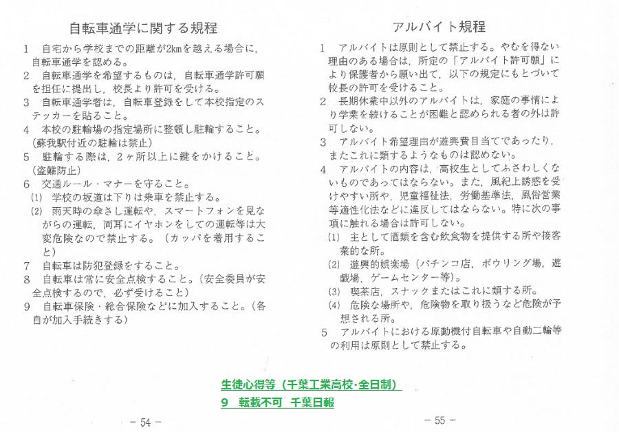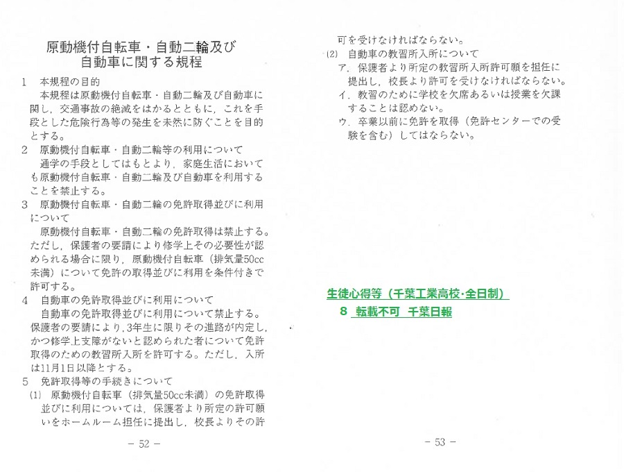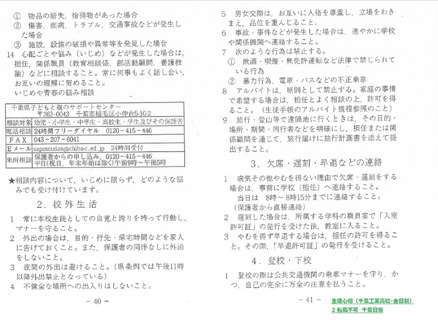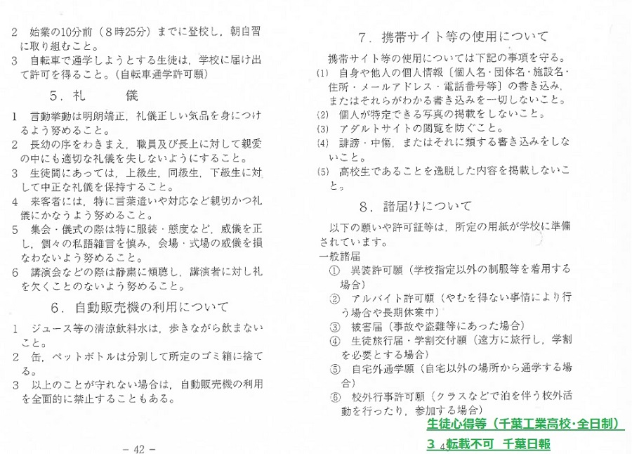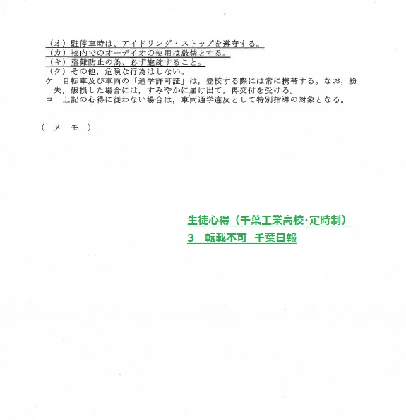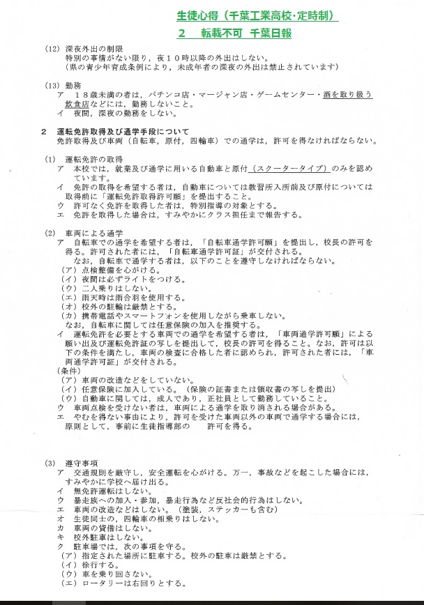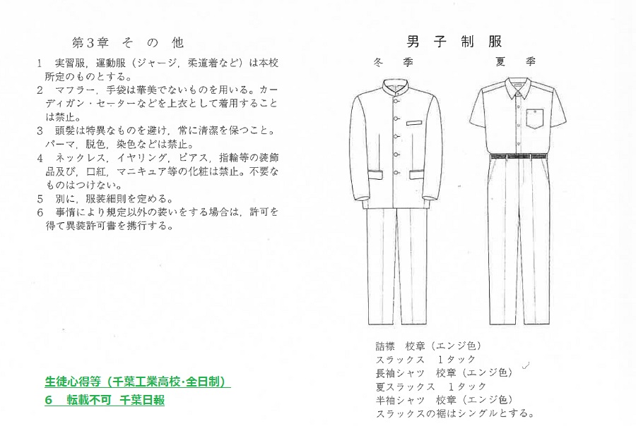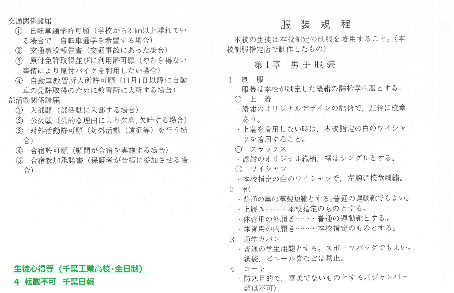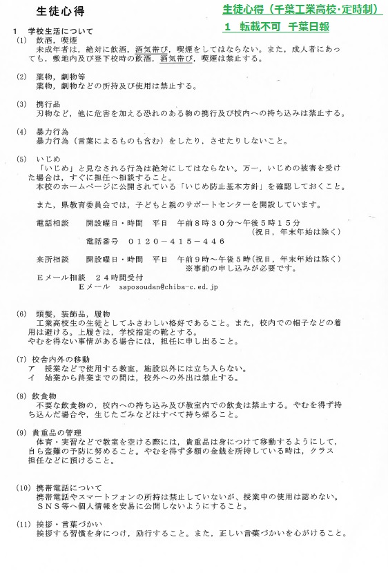 学校名 : 千葉県立千葉工業高校 住 所 : 千葉市中央区今井町1478 掲載内容:生徒心得(定時制)、生徒心得等(全日制)注意点