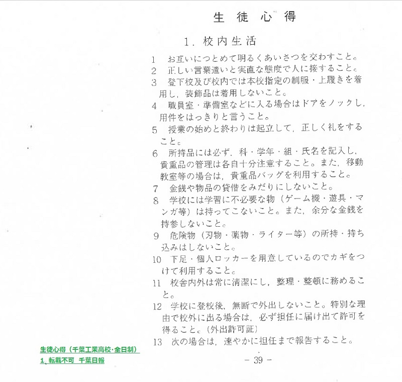 このページは、 千葉県立千葉工業高校(千葉市中央区)のルールを定めた生徒指導規程、いわゆる「校則」を掲載しています。