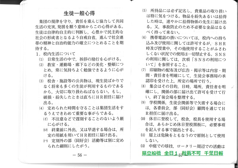 このページは、千葉県立船橋高校(船橋市)のルールを定めた生徒指導規程、いわゆる「校則」を掲載しています。