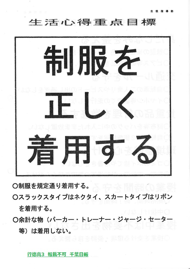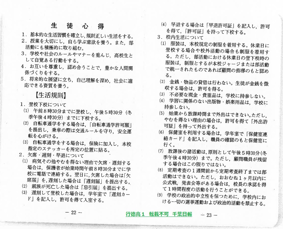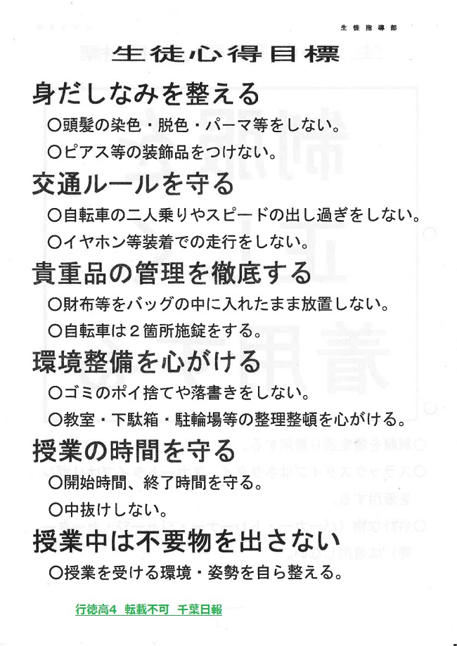 学校名 : 千葉県立行徳高校 住 所 : 市川市塩浜4-1-1 掲載内容:生徒心得、生活心得重点目標等注意点