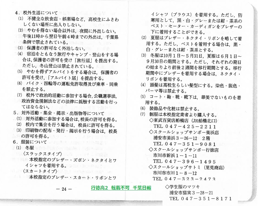 このページは、千葉県立行徳高校(市川市)のルールを定めた生徒指導規程、いわゆる「校則」を掲載しています。
