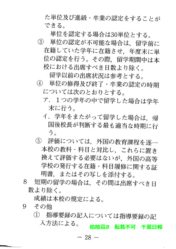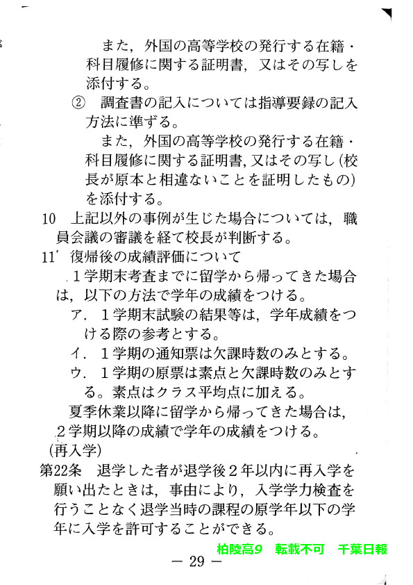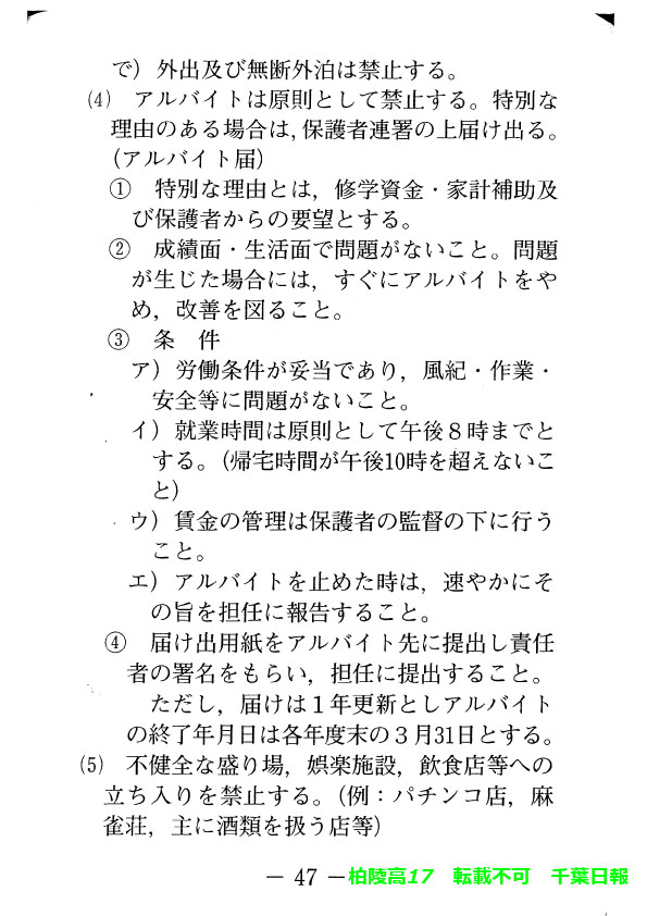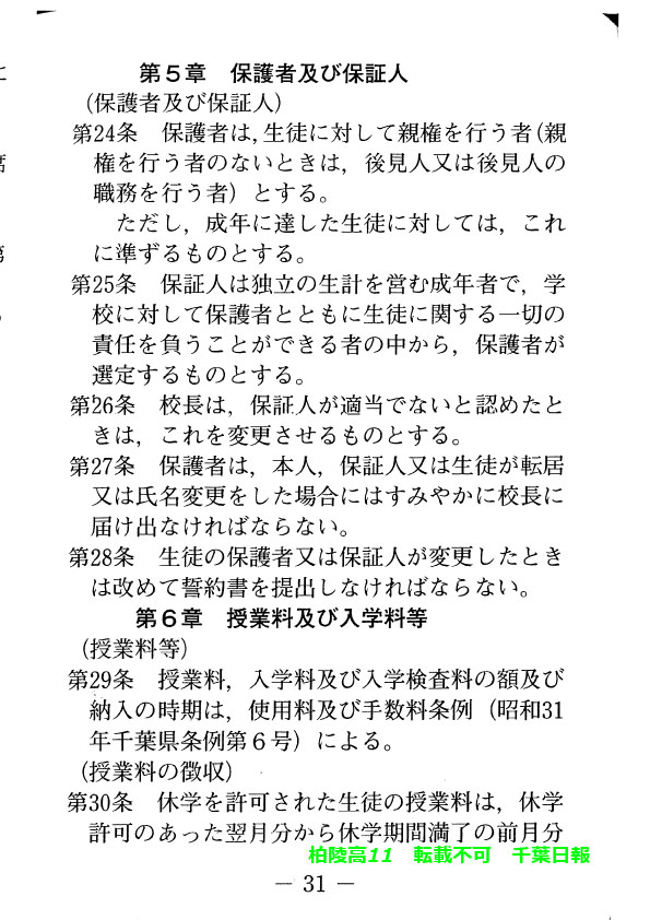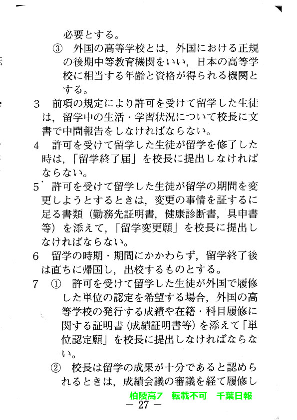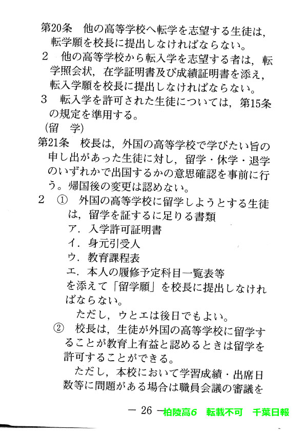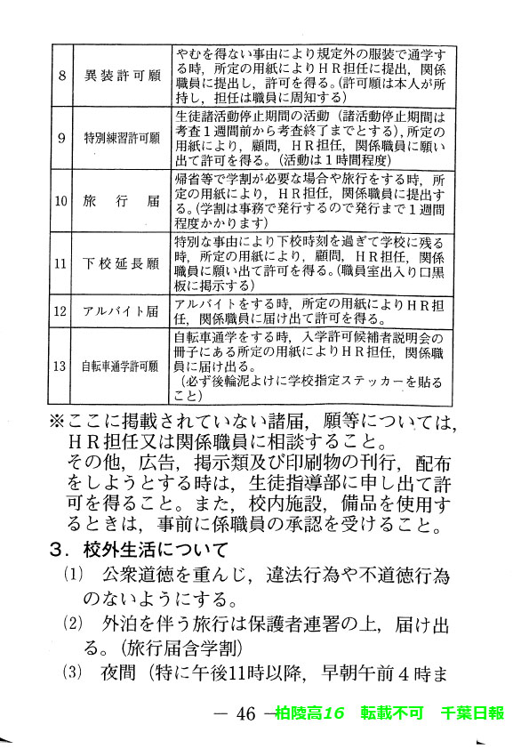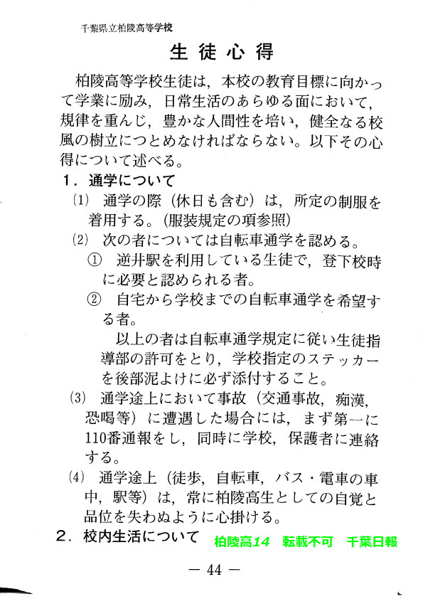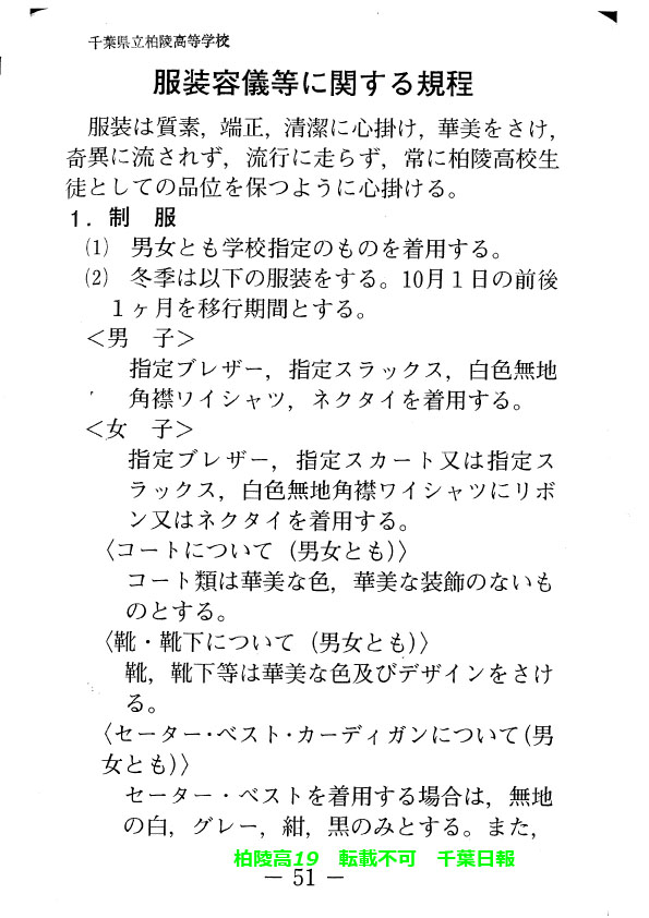 学校名 : 千葉県立柏陵高校 住 所 : 柏市逆井444-1 掲載内容:校則、生徒心得、服装容儀等に関する規程注意点