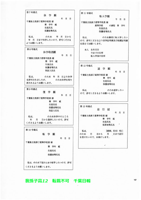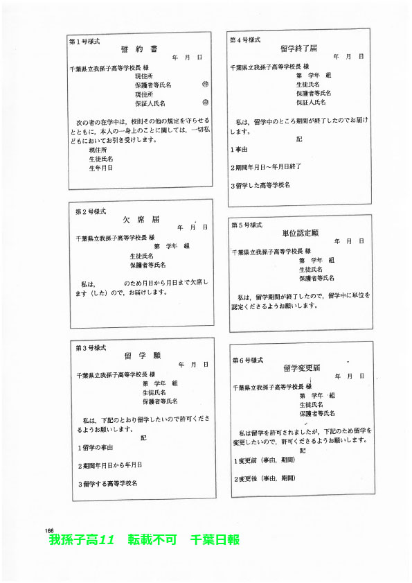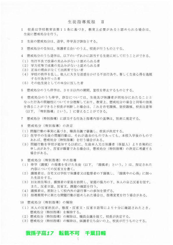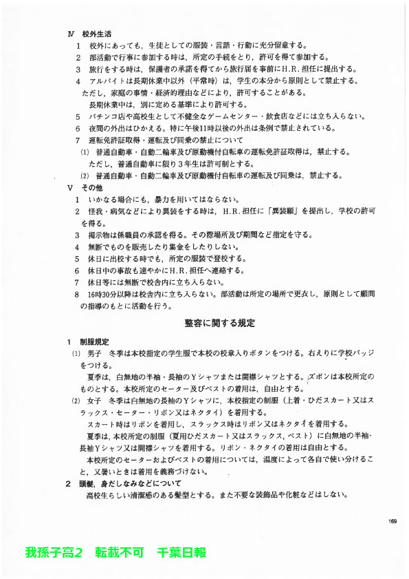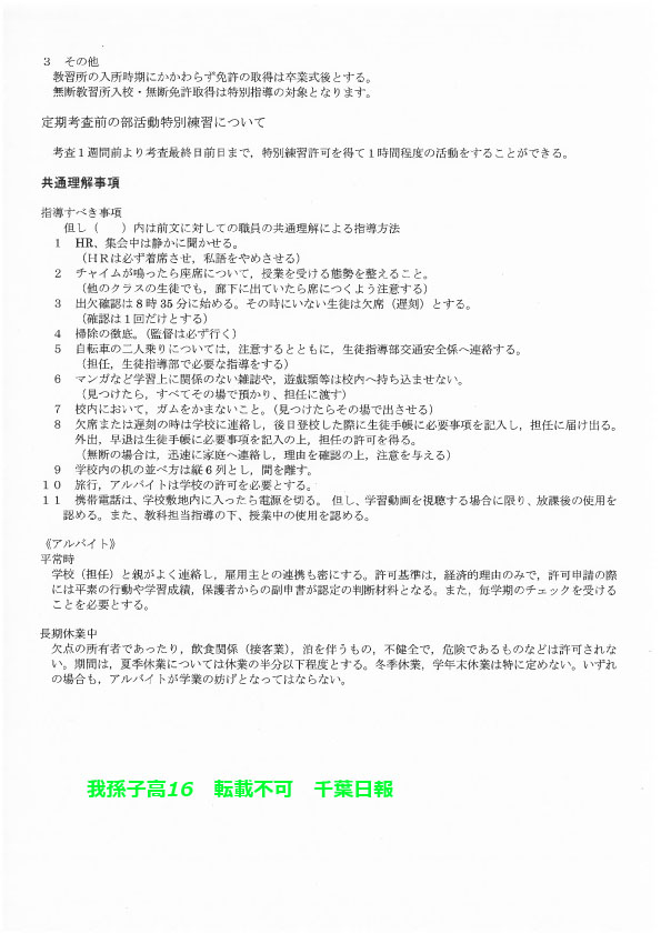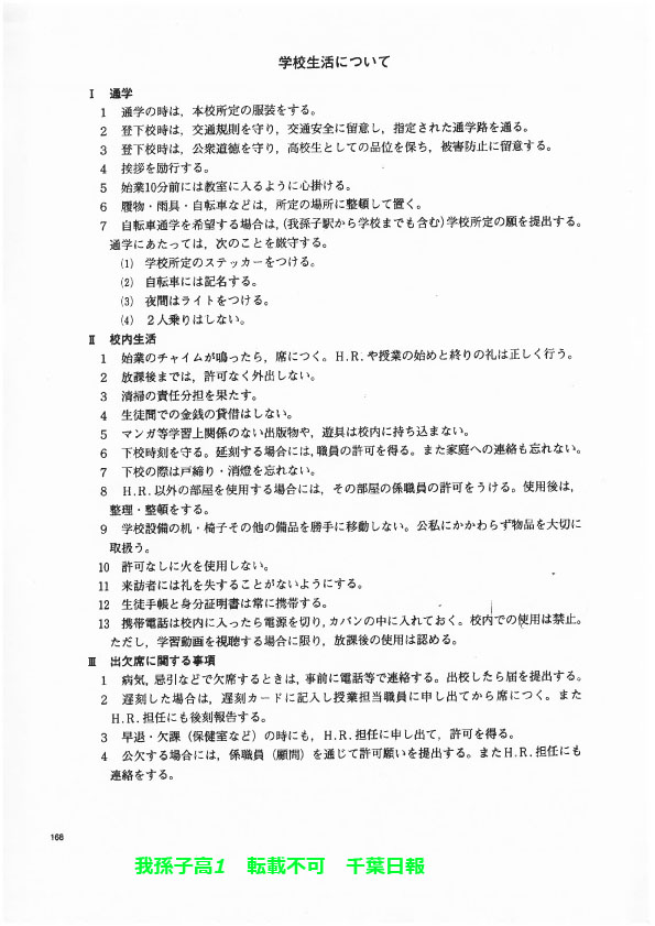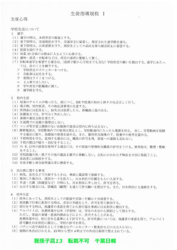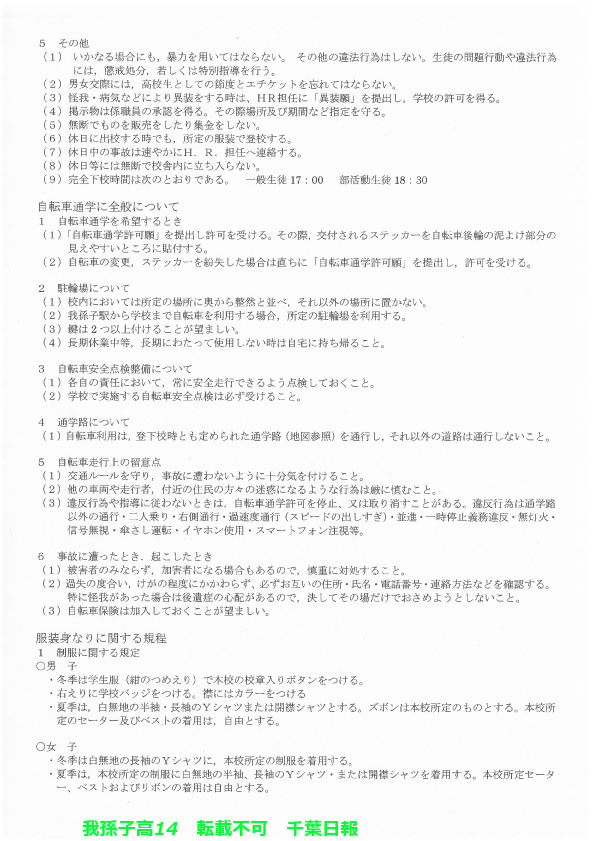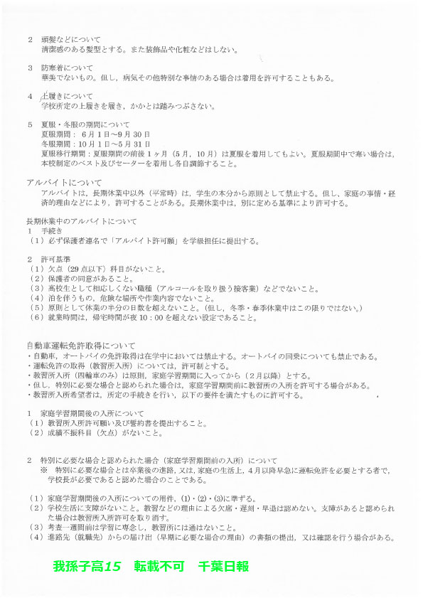 学校名 : 千葉県立我孫子高校 住 所 : 我孫子市若松18-4 掲載内容:校則、学校生活について、生徒指導規程(内規)注意点