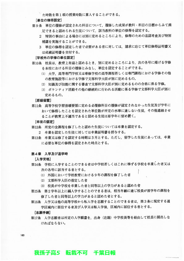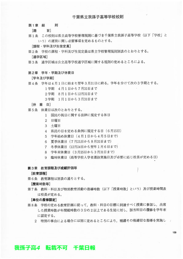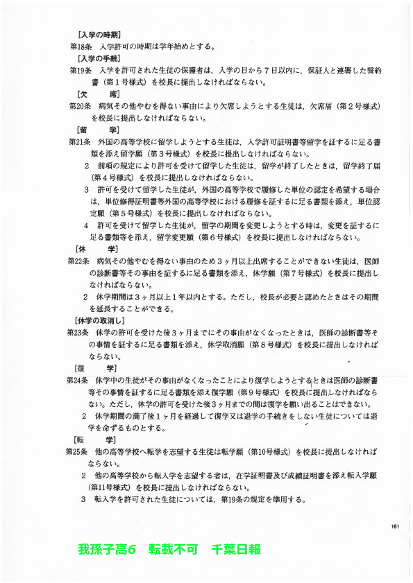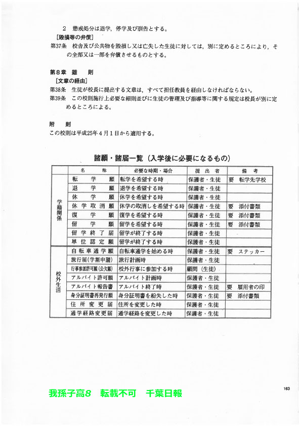 このページは、千葉県立我孫子高校(我孫子市)のルールを定めた生徒指導規程、いわゆる「校則」を掲載しています。