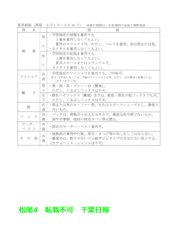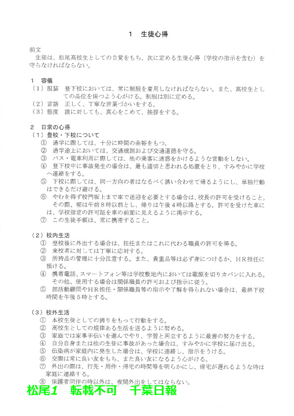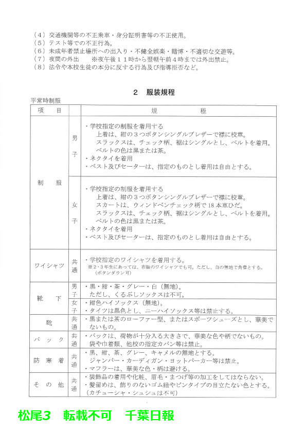 このページは、千葉県立松尾高校(山武市)のルールを定めた生徒指導規程、いわゆる「校則」を掲載しています。