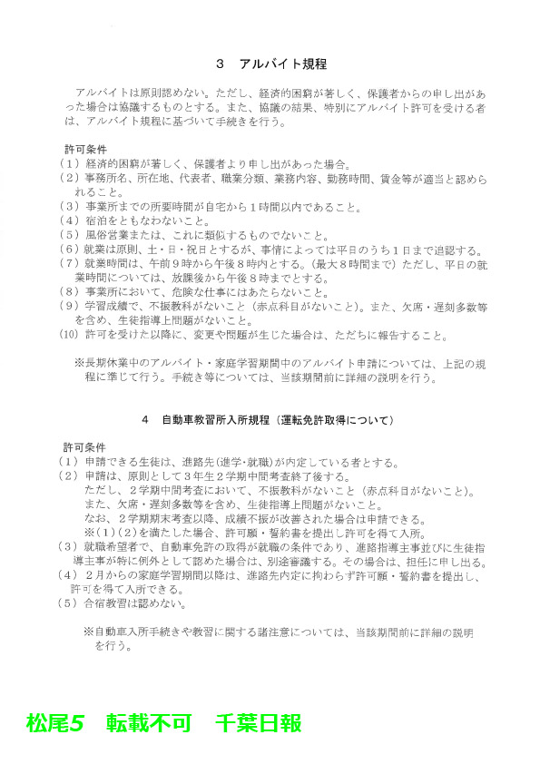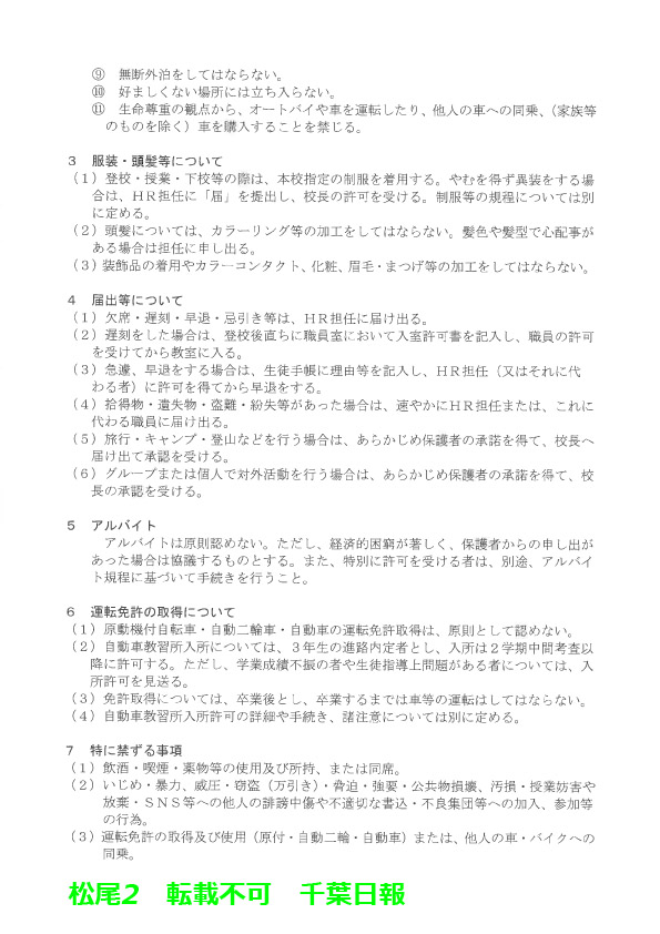 学校名 : 千葉県立松尾高校 住 所 : 山武市松尾町大堤546 掲載内容:生徒心得、服装規程、アルバイト規程、自動車教習所入所規程(運転免許取得について)注意点