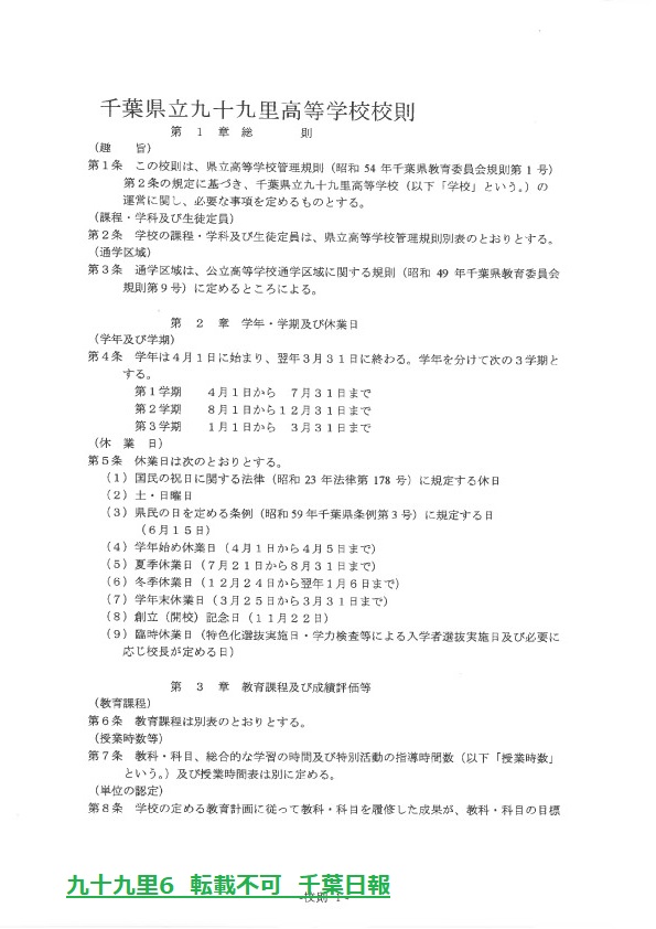 このページは、千葉県立九十九里高校(九十九里町)のルールを定めた生徒指導規程、いわゆる「校則」を掲載しています。