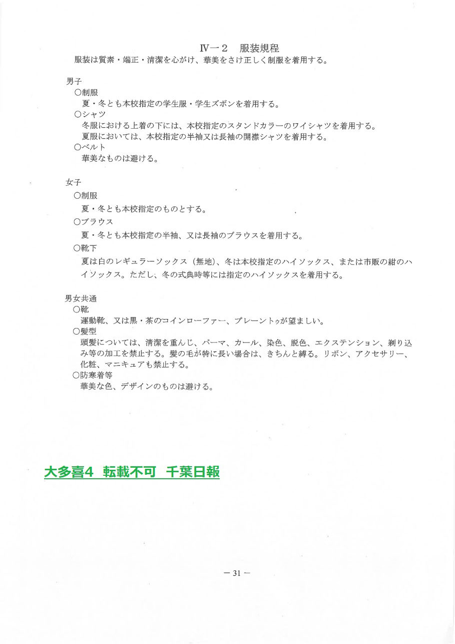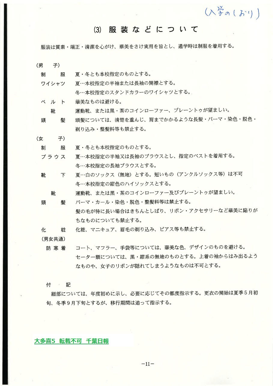 学校名 : 千葉県立大多喜高校 住 所 : 大多喜町大多喜481 掲載内容:生徒心得、服装規程、服装などについて(入学のしおり)注意点
