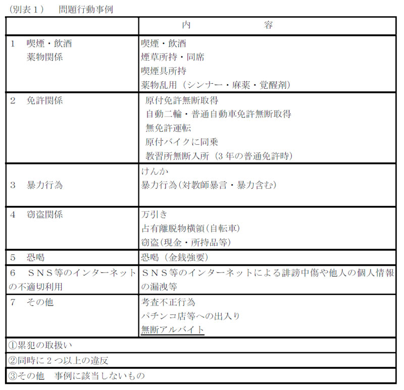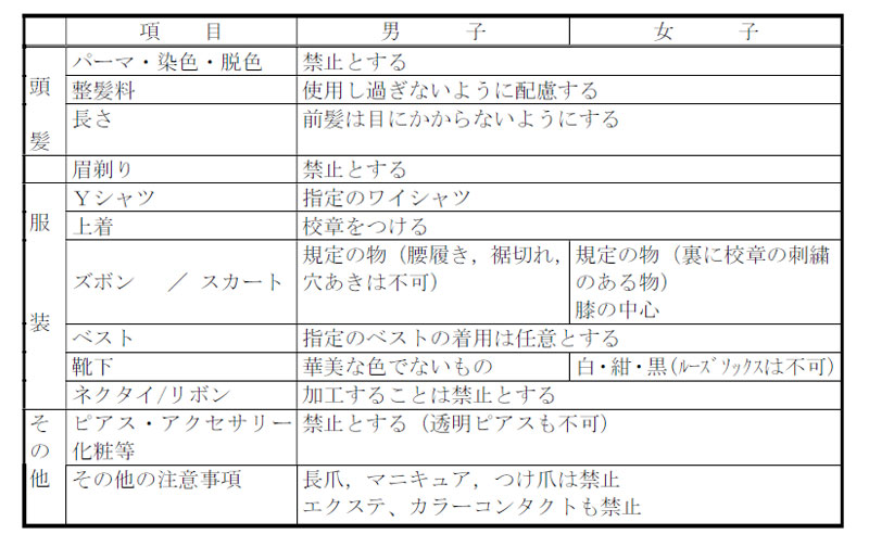 掲載内容:生徒指導等に関わる校内規程 制服・頭髪について 運転免許について アルバイトについて 懲戒処分及び特別指導