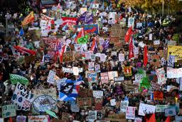 【グラスゴー共同】国連気候変動枠組み条約第26回締約国会議(COP26)が開催中の英北部グラスゴーで5日、地球温暖化対策の徹底を各国政府や産業界に求める抗議デモがあり、世界から集まった参加者が「石炭と石油を使うな」「気候変動は戦争だ」とシュプレヒコールを上げた。