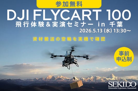 DJI(ディージェイアイ)正規販売代理店として物流ドローンの導入支援を行う株式会社セキド(本社:東京都港区、代表取締役:大下貴之)は、株式会社花縞(本社:千葉県山武市、代表取締役:渡辺信義)と共催で、2026年5月13日(水)に千葉県山武郡横芝光町で「DJI FLYCART 100 飛行体験&実演セミナー」を開催します。